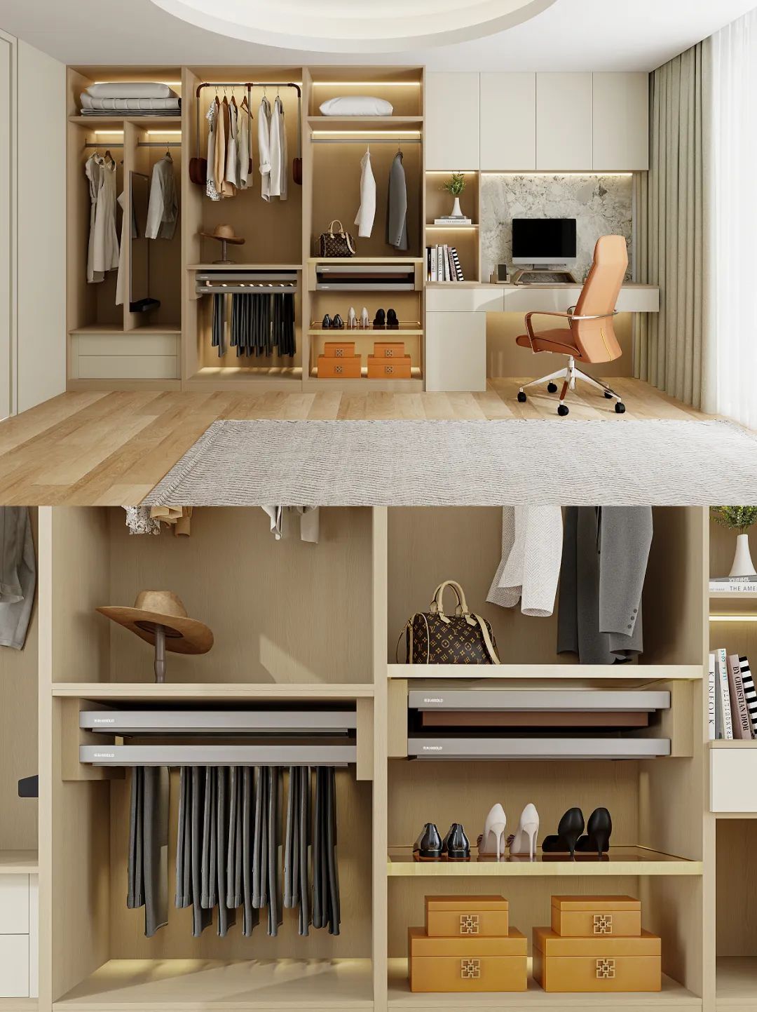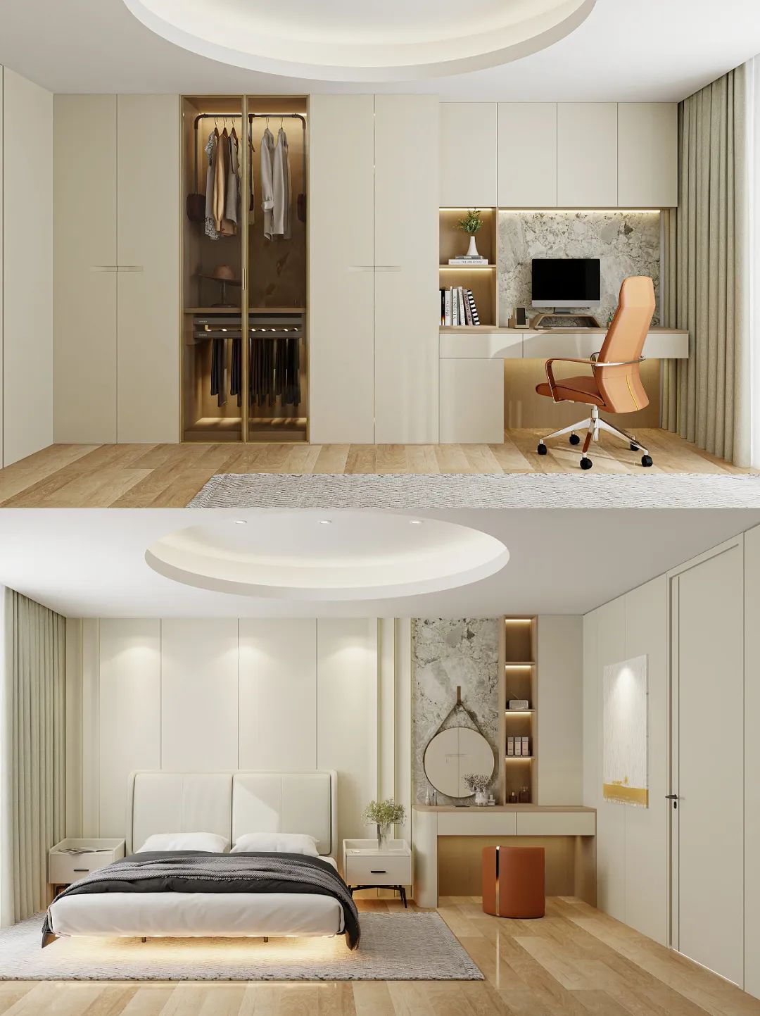 ??書桌柜與衣柜一體化設(shè)計,視覺效果更整體流暢,節(jié)省空間的同時也加大了儲物空間。