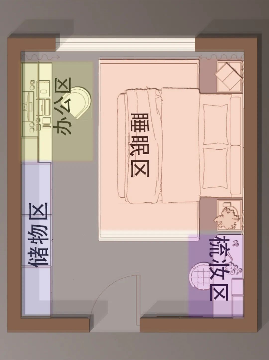 ??在布局上處于室內(nèi)“黃金地段”房間的正中央,其他功能區(qū)域圍繞睡眠區(qū)展開。