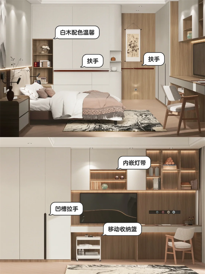 ??在衣柜門和進門墻面增加了扶手設(shè)計,老人行動有支撐更加安全便捷。