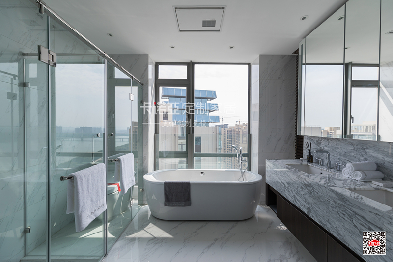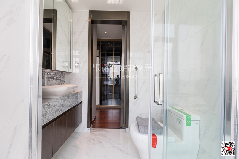 深色浴室柜體點睛,加上大面積玻璃的使用,衛(wèi)生間大氣明亮,空間通透開闊。