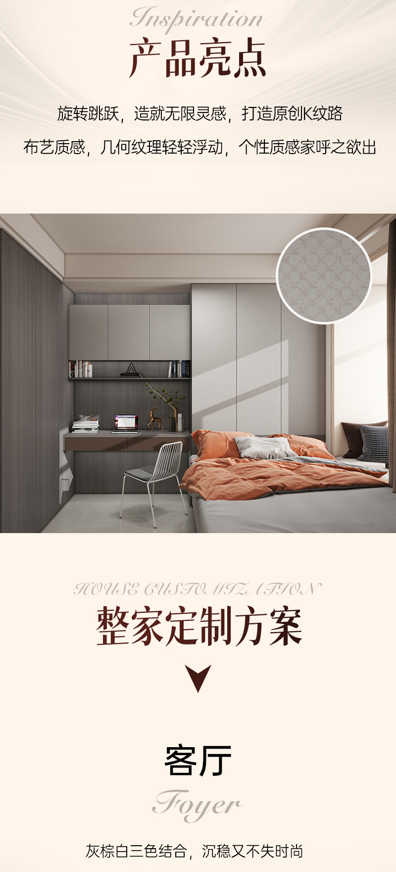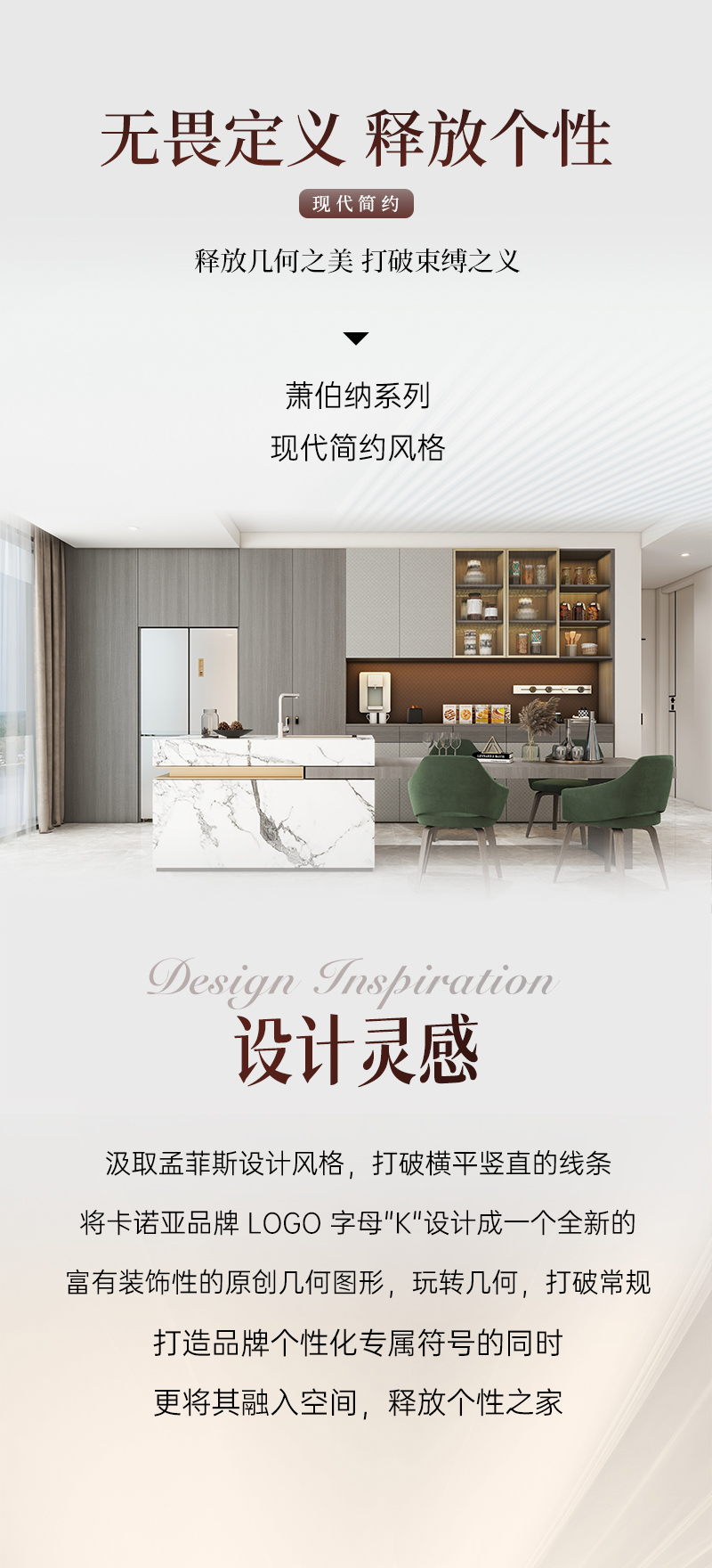蕭伯納系列 | 現(xiàn)代簡約風(fēng)格汲取孟菲斯設(shè)計(jì)風(fēng)格,打破橫平豎直的線條,將卡諾亞品牌 LOGO 字母"K"設(shè)計(jì)成一個(gè)全新的富有裝飾性的原創(chuàng)幾何圖形,玩轉(zhuǎn)幾何,打破常規(guī),打造品牌個(gè)性化專屬符號的同時(shí),更將其融入空間,釋放個(gè)性之家。