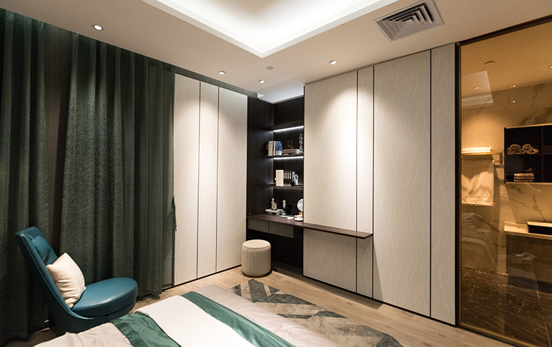 灰色護(hù)墻系統(tǒng),采用不對(duì)等寬度的護(hù)墻板,流暢豎線條,簡(jiǎn)單而不失優(yōu)雅,在視覺上更顯開闊,營(yíng)造自然舒心的睡眠環(huán)境。
