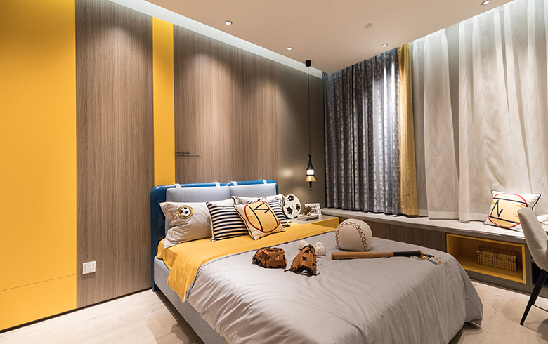 不同于普通的兒童房墻面采用油漆,本套空間的墻面加入了護(hù)墻板,除了營(yíng)造簡(jiǎn)潔明快的專屬兒童臥室特征之外,采用原木色與活力橙條紋相間的護(hù)墻板,清新健康,為整個(gè)空間增添了活力。