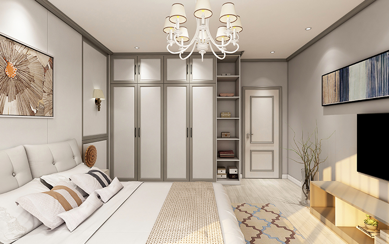 簡歐風(fēng)格特有的方正造型灰色邊框的木門,一改木門平面單一的視覺印象,同時(shí)與到頂衣柜、護(hù)墻板在紋理及材質(zhì)上相呼應(yīng),整體空間寧靜素雅,溫暖直抵人心。