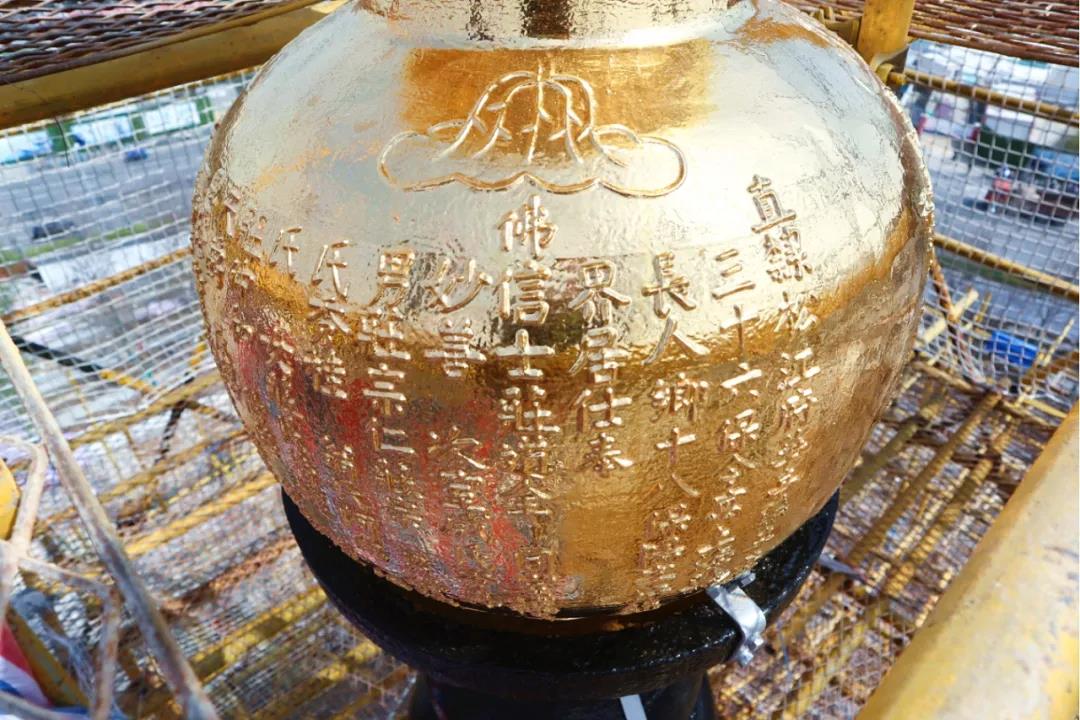 ? ? ? ? 龍華塔是上海地區保存最完好的宋代樓閣式塔,明人馮遷譽其為“千年飛塔”。舊時,“秋江塔影”與“龍華晚鐘”同樣蜚聲海內外。龍華塔頂端塔剎葫蘆,上一次貼金箔修繕是在1984年,歷經時間和風雨的洗禮,斑駁銹蝕,金箔缺損嚴重。本次保養維護過程中,維修人員為塔剎葫蘆重貼金箔,再現璀璨金光。