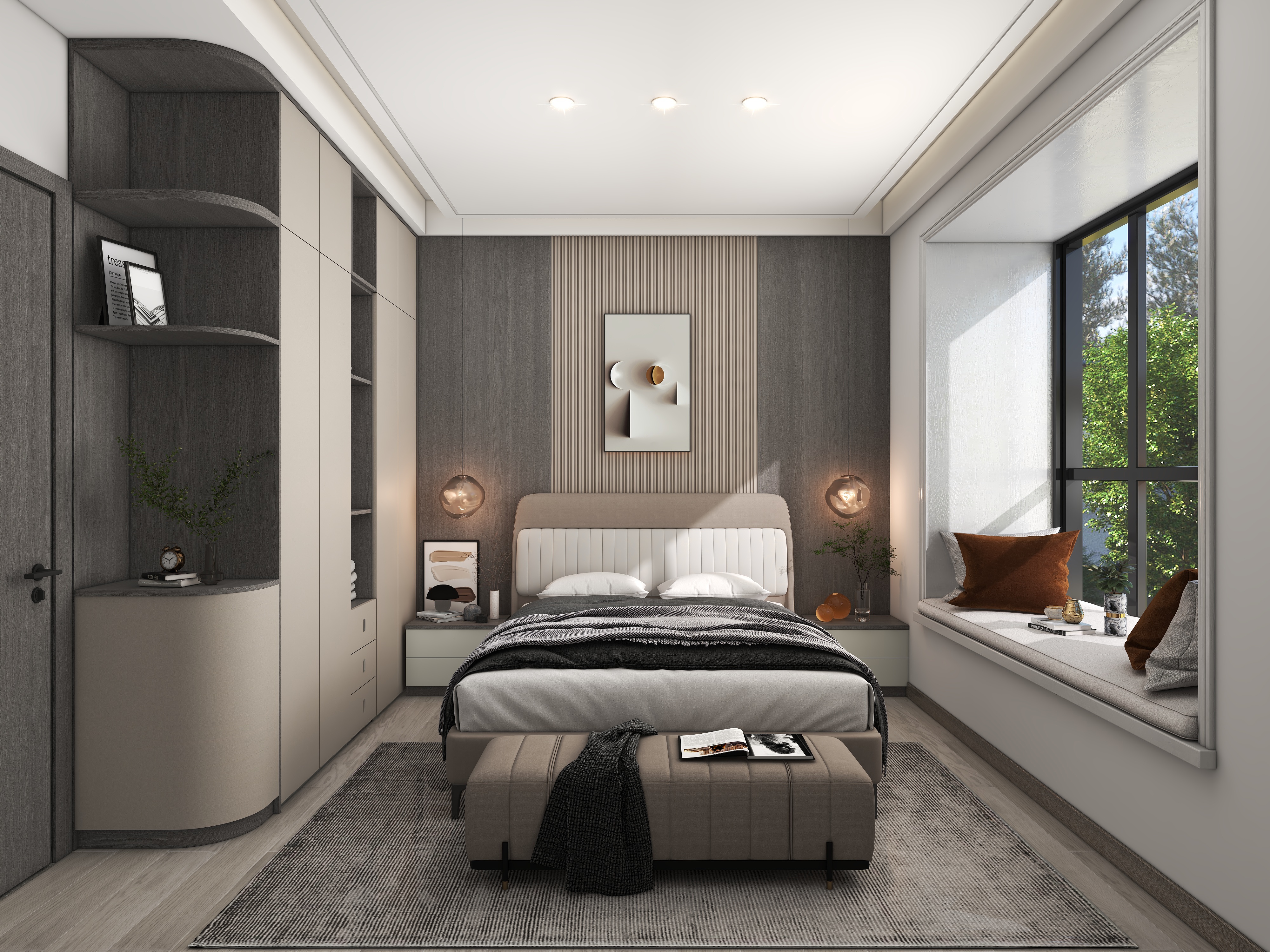 設(shè)計師為輕奢風格的臥室定制了精致的到頂衣柜,還將衣柜分為三個區(qū)域,右邊為男女主人的衣物收納區(qū)域,左側(cè)設(shè)計成梳妝區(qū)域,飄窗則為閱讀休閑區(qū)域。