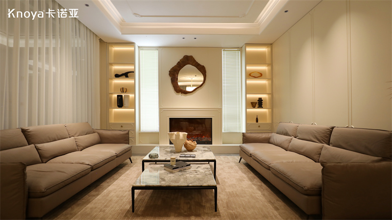 客廳空間,采用卡諾亞新品輕法式風(fēng)格爾漫系列,勾勒溫柔、舒適的慵懶氛圍又不失優(yōu)雅格調(diào)。