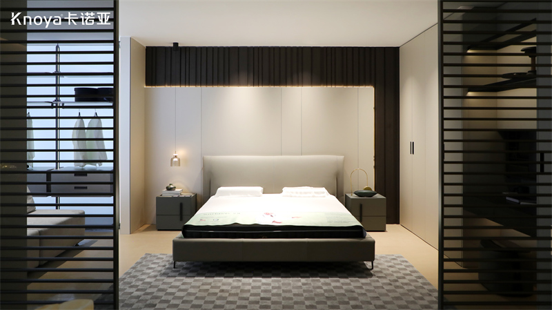 臥室空間,采用卡諾亞新品極簡(jiǎn)風(fēng)格覽境系列,以柜墻門一體化設(shè)計(jì)搭配更多功能系統(tǒng),打造符合生活偏好與美學(xué)的“臥室系統(tǒng)”,汲取臥室系統(tǒng)“閑忙享樂學(xué)”生活方式靈感。