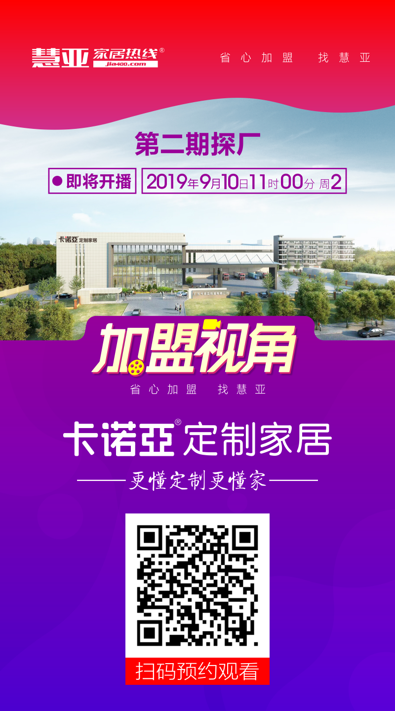重磅信息?。?!9月10日慧亞家居熱線《加盟視角》將會正式開播,走進家居行業(yè)知名品牌卡諾亞,專業(yè)定制家居18年,全國1000+專賣店,20余萬㎡工業(yè)4.0智造基地,每年服務(wù)百萬家庭。本期節(jié)目將全方位揭曉卡諾亞是如何讓加盟商放心賺錢!