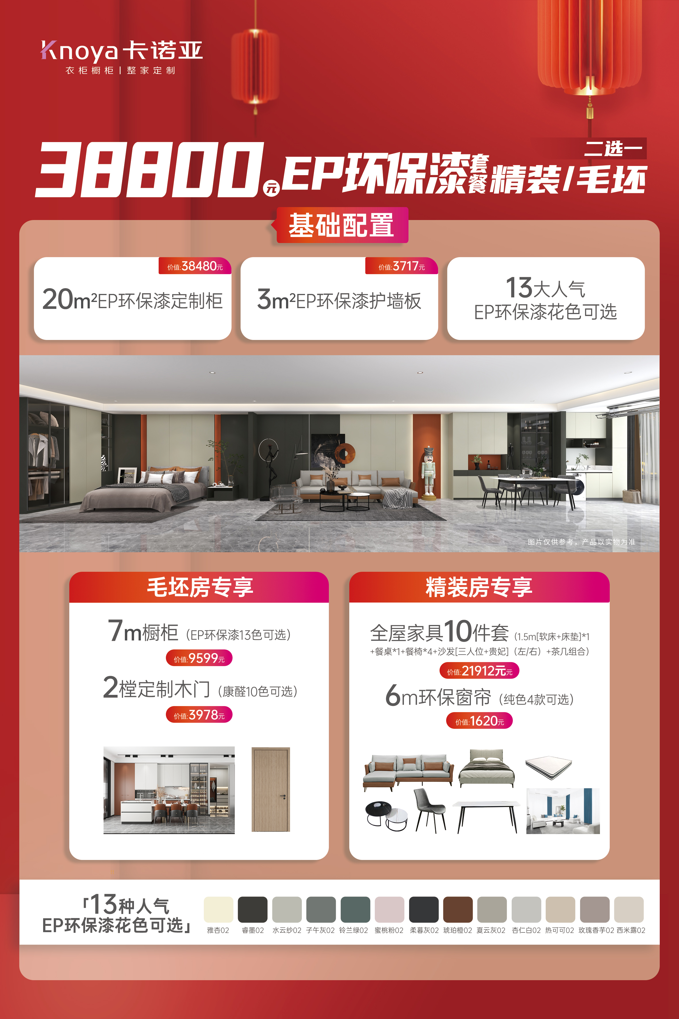 本次大促,除了一直在推出的28800元康醛整家套餐,還重磅推出了38800元EP環(huán)保漆整家套餐,分別針對(duì)毛坯房和精裝房配置了不同的套餐內(nèi)容,買(mǎi)套餐再送3㎡背景墻,并且將柜墻門(mén)一體化理念貫穿到整家套餐之中,讓消費(fèi)者買(mǎi)得實(shí)惠、裝得省心、住得舒適!